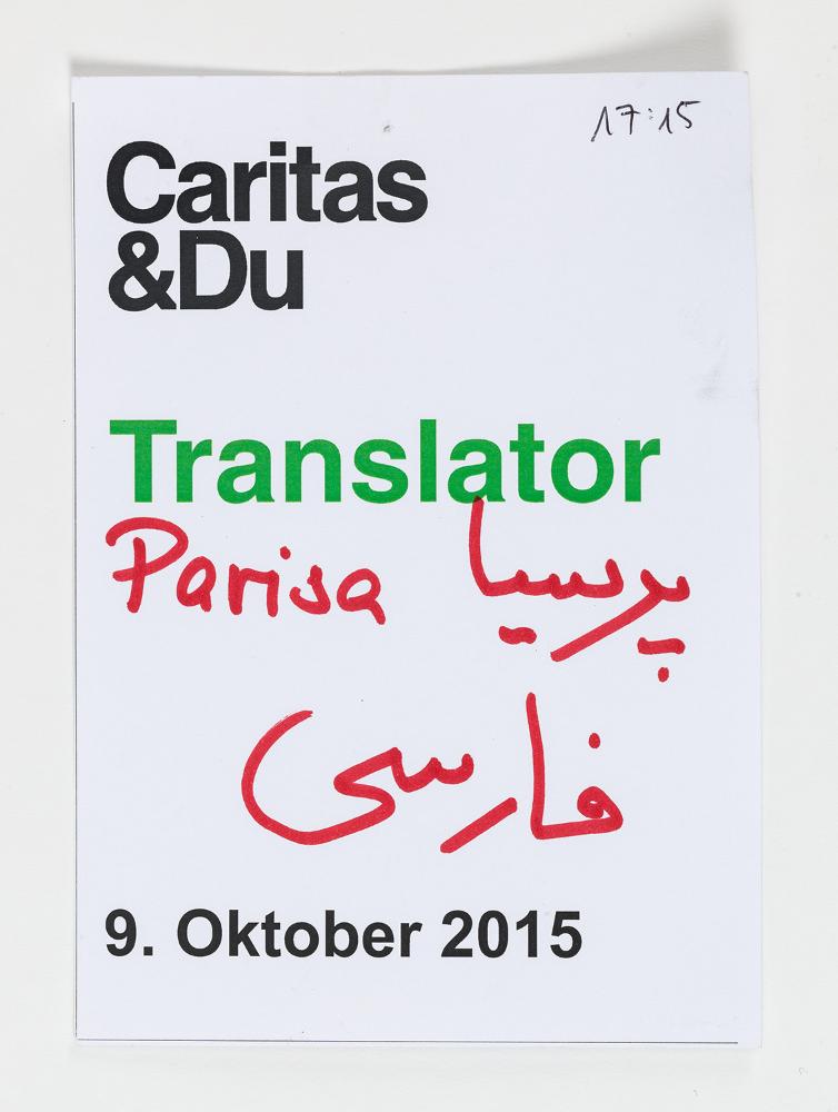 Ausweise mit Angabe des Vornamens und der gesprochenen Fremdsprachen von ehrenamtlichen ÜbersetzerInnen, die am Wiener Westbahnhof Transitflüchtlinge betreuten.