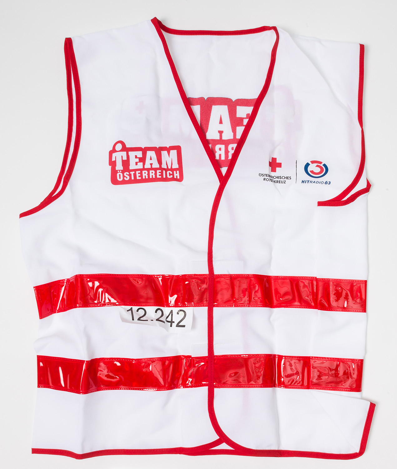 Für Freiwillige „Team Österreich“, Logo Österreichisches Rotes Kreuz, Logo Hitradio Ö3 (vorne und Rückenteil), rote Reflektorstreifen; vorne Aufnäher mit Nummer „12.242“