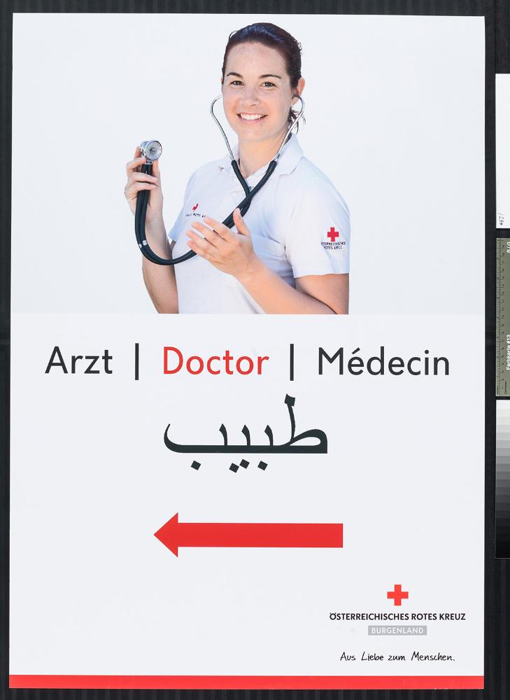 Plakat Rotes Kreuz Burgenland, Nickelsdorf: „Arzt“, mehrsprachig, Pfeil nach links, bebildert; rechts unten: Logo RK Burgenland „Aus Liebe zum Menschen“