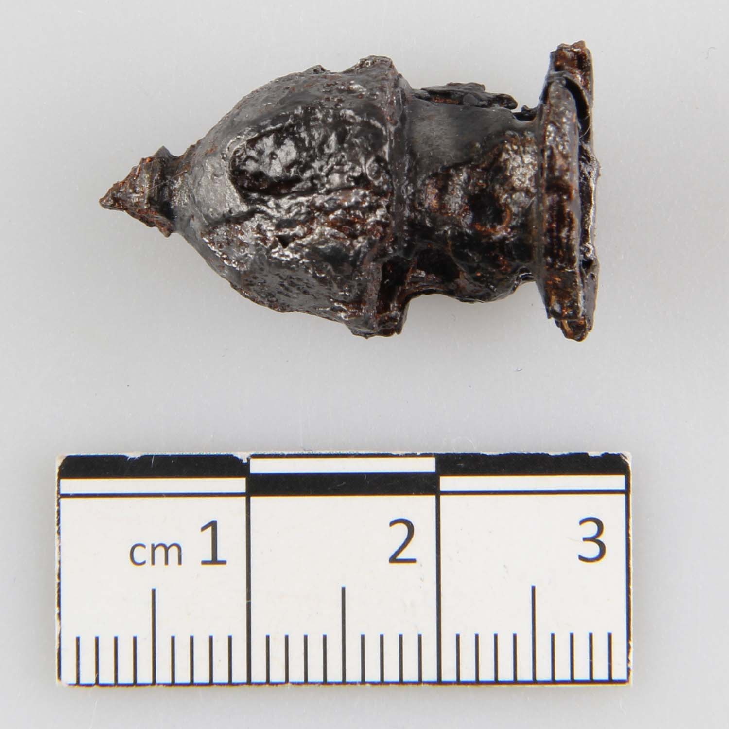 Tropfenförmiges Endstück, stärker korodiert. L. 2,55cm. Dm. 1, 61 cm, Gew. 10,1g