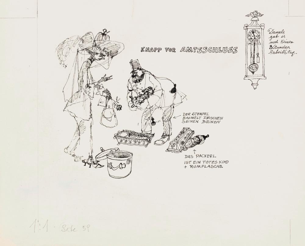 Illustration / Wilfried Zeller-Zellenberg: Seid lieb auch zu Disteln. Vom Undoweiter der k. u. k. Herrlichkeit 1918 bis dato und in alle Ewigkeit. Gezeichnet und geschrieben von Wilfried Zeller-Zellenberg, Europa Verlag Wien, 1976.
