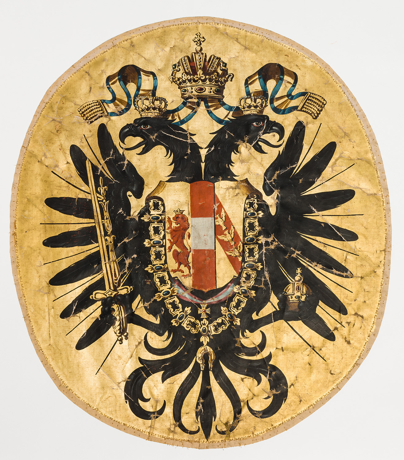 Mittelteil einer Fahne. Vorderseite: Kaiserlicher Doppeladler auf goldenem Textil. Rückseite: Tiroler Adler.