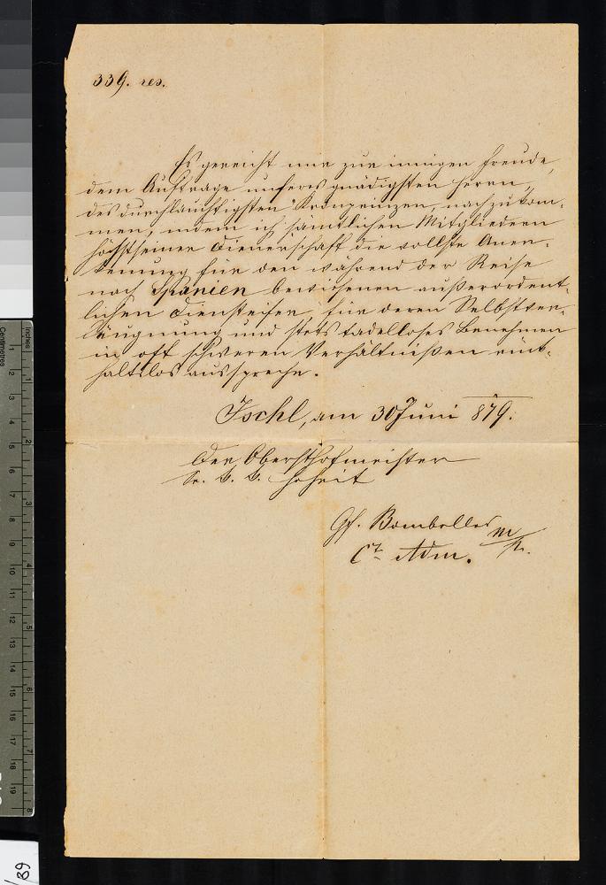 Es gereicht mir zur innigen freude dem Auftrage unseres gnädigsten Herrn des durchlauchtigsten Kronprinzen nachzukommen, indem ich sämtlichen Mitgliedern höchstseiner Dienerschaft die vollste Anerkennung für den während der Reise nach Spanien bewiesenen außerordentlichen Dienstreisen für deren Selbstverlängerung und stets tadelloses Benehmen in oft schweren Verhältnissen enthaltlos ausspreche. Ischl, am 30. Juni 1879.