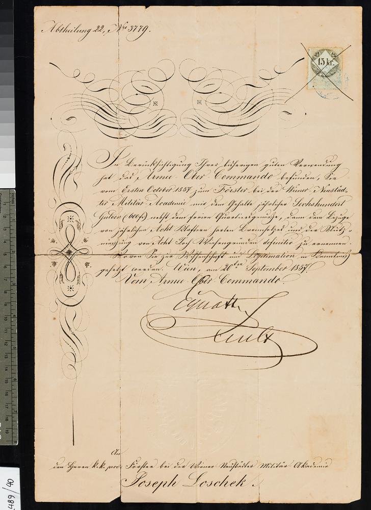 Brief von der Wiener Neustädter Militärakademie an Josef Loschek vom 20. September 1857