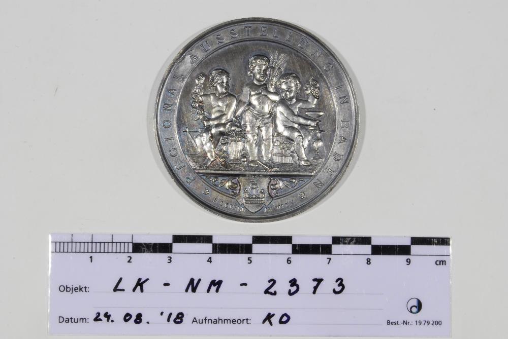avers: Staffage dreier Putten als Allegorien von Garten-, Acker- und Weinbau mit entsprechenden Attributen, Stadtwappen Baden