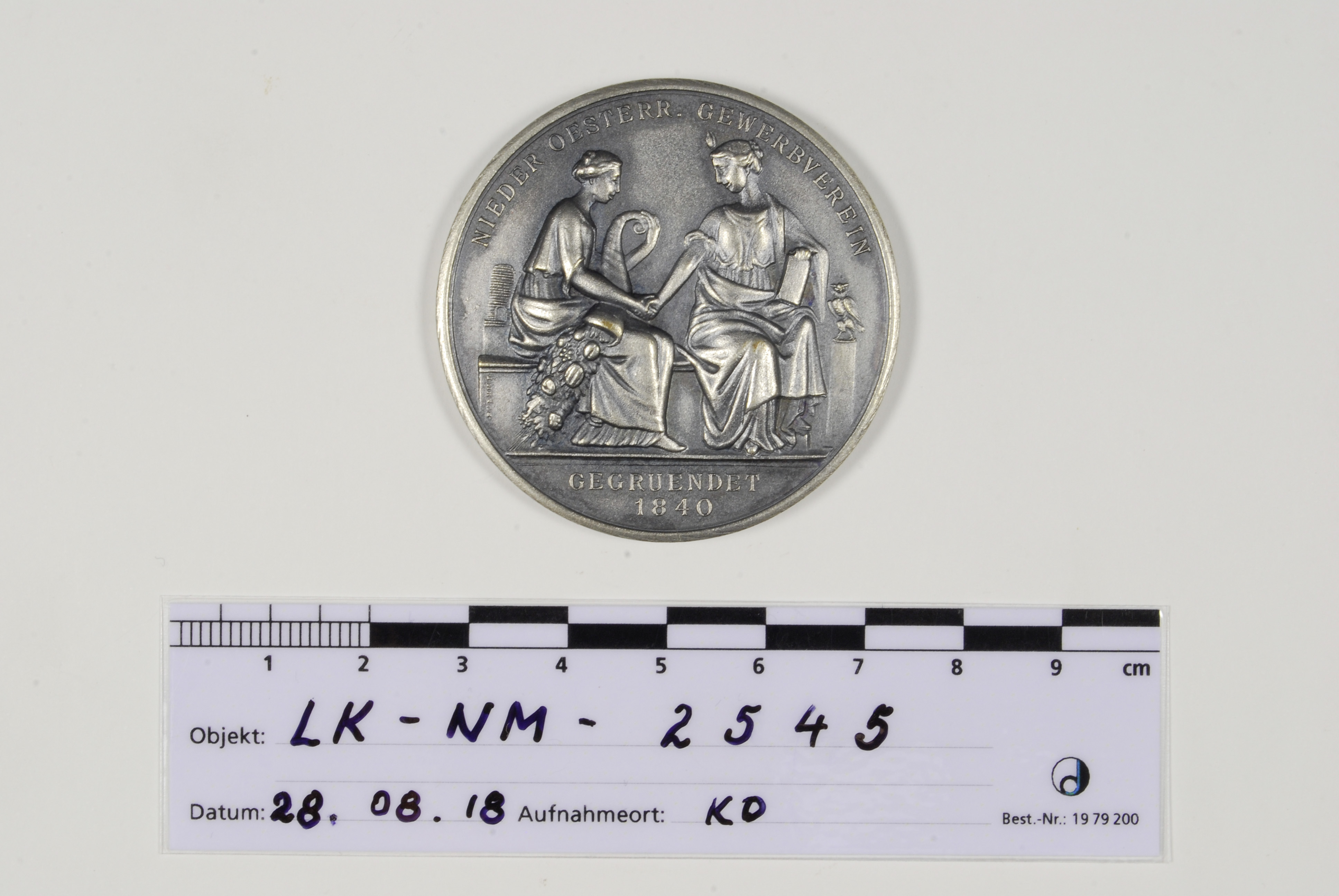 avers: Links sitzend die Nymphe Amaltheia mit Füllhorn und Bienenkorb, rechts sitzend die Ruhmesgöttin Fama mit Schreibtafel und Eule, einander zugewandt und die Hände reichend