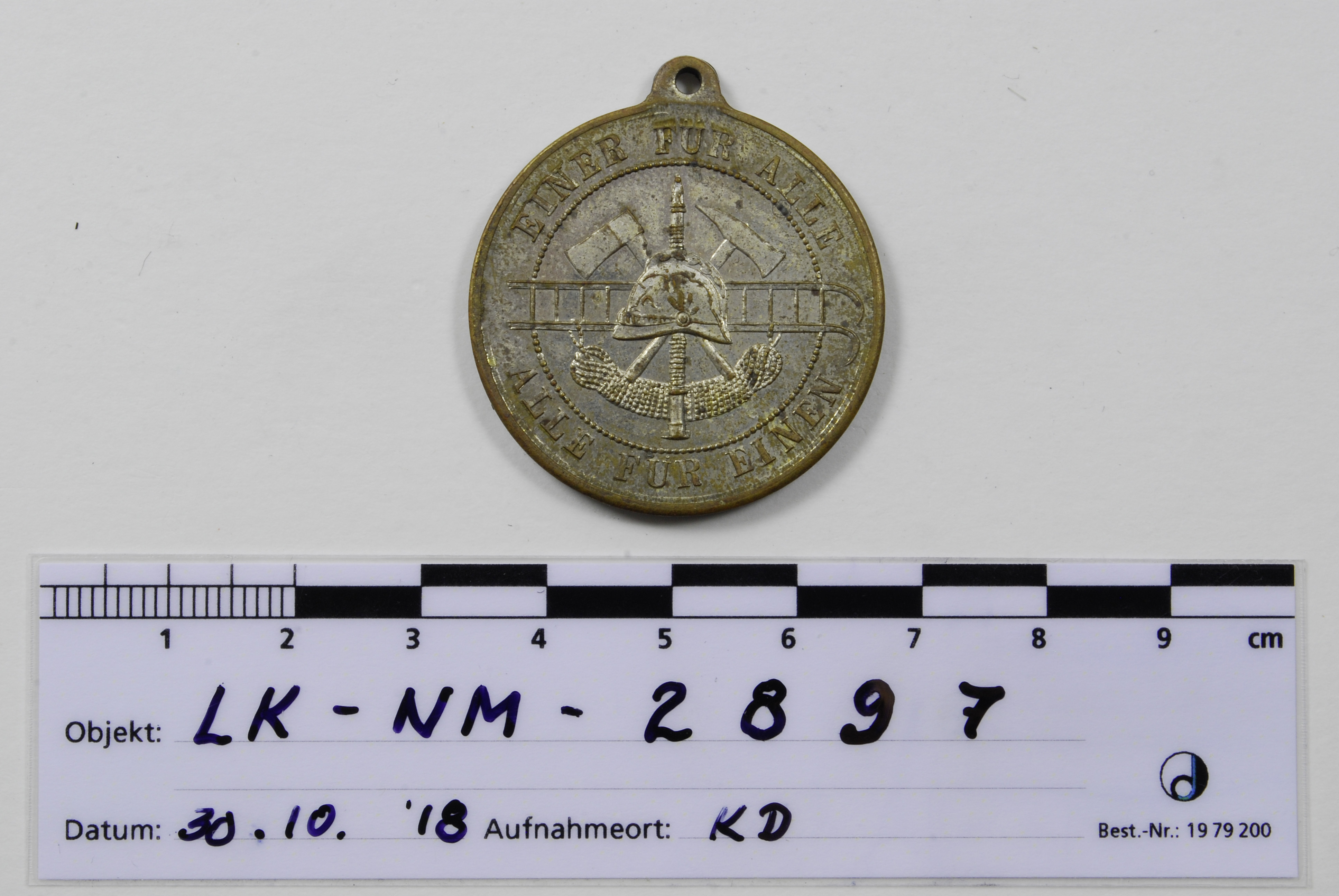 avers: Staffage aus Feuerwehrhelm, Brandäxten, Löschspritze und Seil