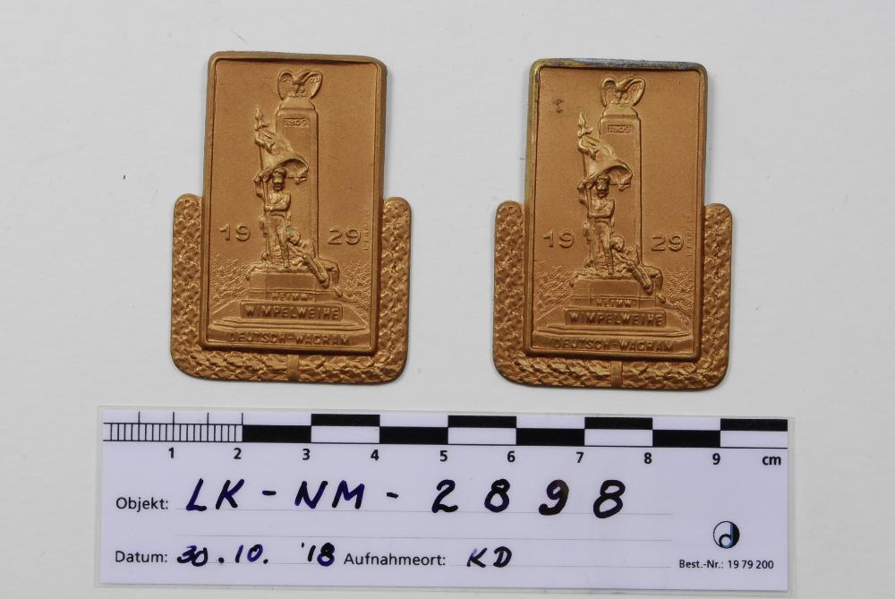 Messing, geprägt, bronziert, Nadel verlötet (fehlt