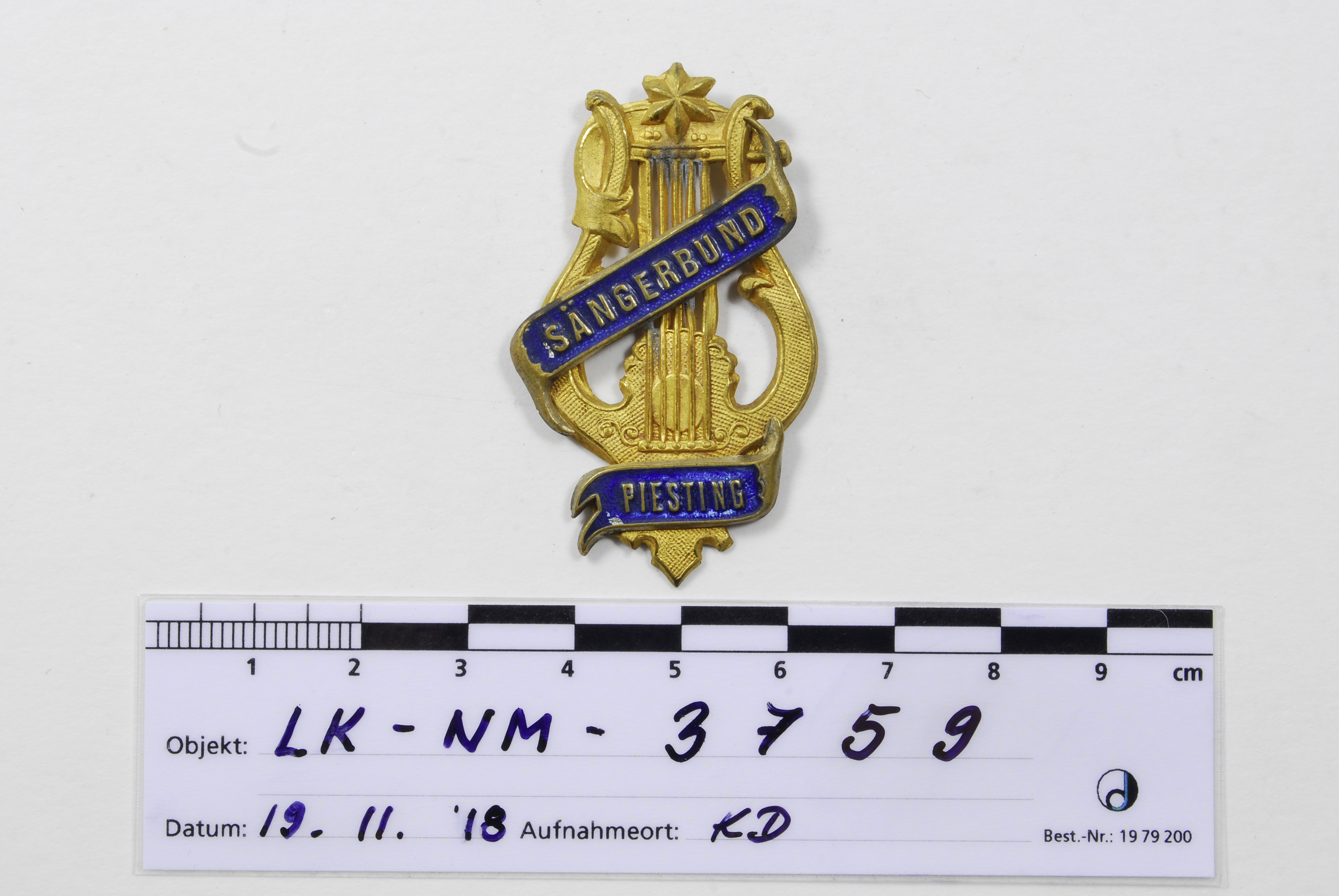 Technische DetailsMessing, geprägt, montiert, versilbert, vergoldet, teils opak blau lackiert, Nadel verlötet (fehlt)