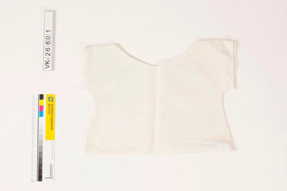 Kurzärmeliges Puppenleibchen aus weißem Leinen.