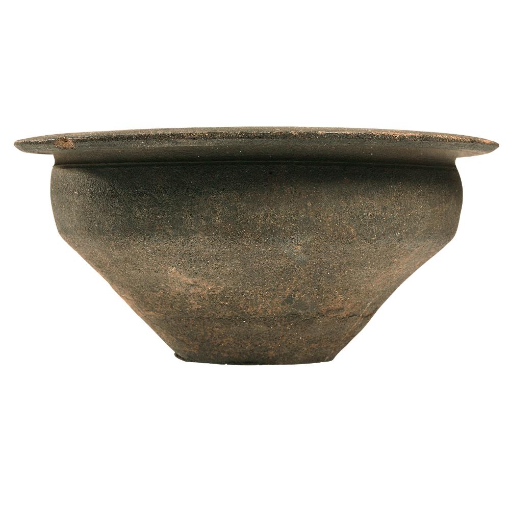 Geklebte Ganzform einer Schüssel mit ungerilltem Horizontalrand. Unterhalb des Randes Rille. Zylindrische obere Gefäßhälfte, nach Wandknick verläuft die Wand zum Boden hin konisch. Plane Standfläche.