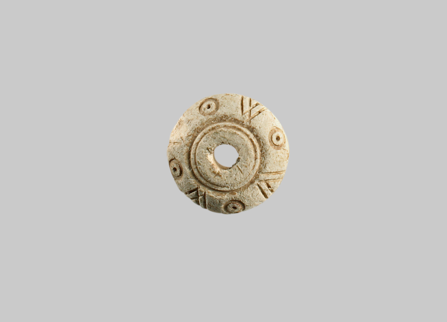 Gewölbte Oberseite mit zentralem Loch, zwei konzentrischen Rillen, vier einfachen Kreisaugen und Kerbdekor.