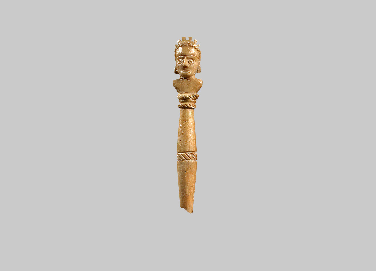 Nackte Frauenbüste auf profiliertem Sockel. Großer Kopf mit ovaler Gesichtsform, markanter, hervortretender Nase, großen, runden, in der Mitte gelochten Augen und einem durch zwei parallele Linien angedeuteten Mund. Im Bereich der Augenbrauen verläuft eine durchgehende, leicht geschwungene, horizontale Linie. Auf der Vorderseite trägt die Figur gesträhntes, nicht ganz kinnlanges Haar, auf der Rückseite zeigt sich netzartige Anordnung der Frisur. Der Kopf ist auch auf der Rückseite plastisch ausgebildet. Auf dem Kopf ist ein 6-zackiger, kronenartiger Kopfaufsatz. Die beiden Wülste am Sockel sind mit schrägen Kerben verziert. An der breitesten Stelle des glatten Schaftes befinden sich zwei umlaufende horizontale Linien, dazwischen schräge Kerben. Die Spitze des Schaftes ist abgebrochen. Die Oberfläche ist poliert.