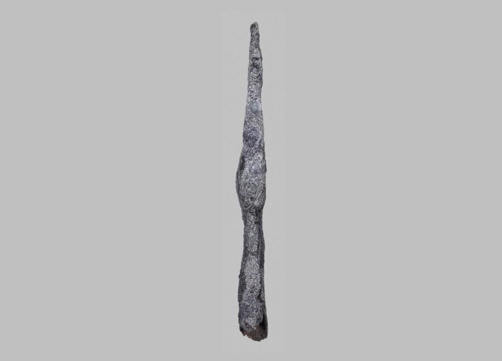 Vierkantige Bolzenspitze mit schlanker, pyramidenförmiger, leicht abgesetzter, abgebrochener Spitze und mit fragmentierter, geschlossener, konischer, im Querschnitt kreisförmiger Tülle.