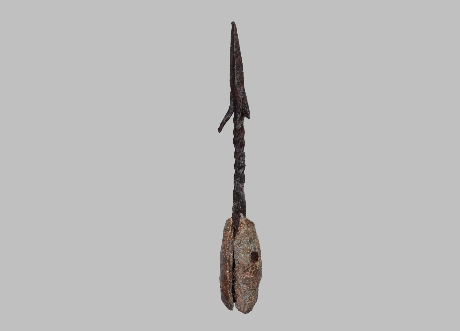 Plumbata mit stark ausgeprägtem Mittelgrat und beidseitigen Widerhaken. Ein Widerhaken ist ganz, der andere fragmentiert erhalten. Der Schaft ist tordiert. Die geöffnete Bleimanschette mit dem Nietloch ist kreisförmig im Querschnitt.