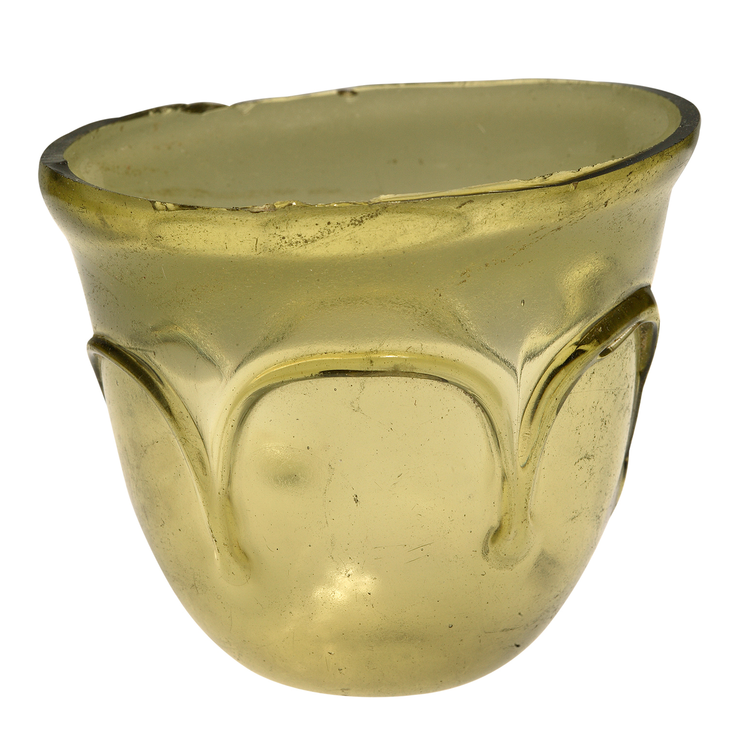 Intakter halbeiförmiger Becher. Leicht nach außen gebogener abgesprengter Rand. Dekor in Form von heiß aufgebrachten hufeisenförmigen Glasfadenauflagen. Moosgrünes Glas, frei geblasen.