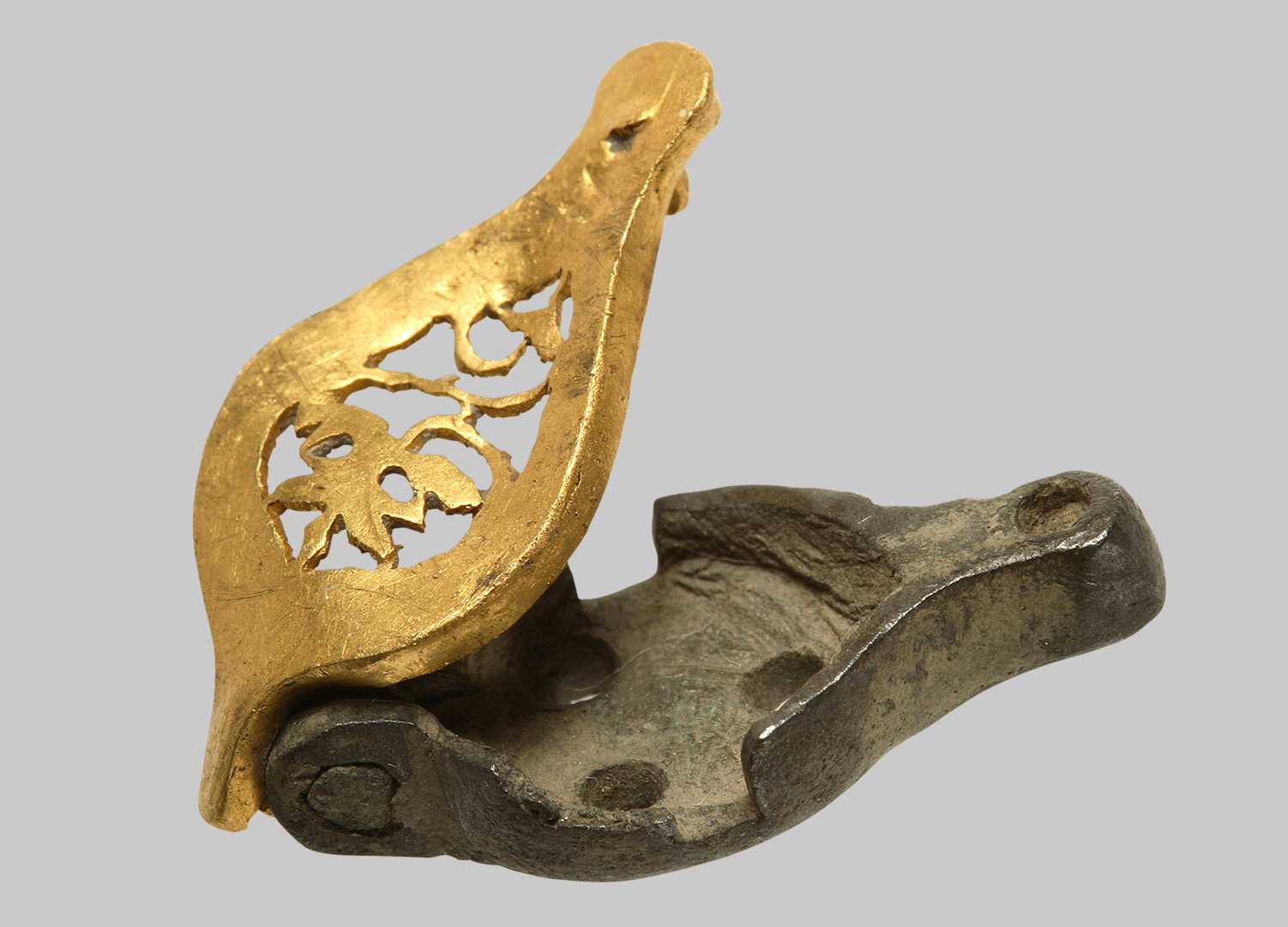 Blattförmig. Deckel aus Gold mit floralem Durchbruchsdekor. Bronzener Kapselboden mit zwei seitlichen Ausnehmungen und drei Löchern zum Durchziehen der Schnur. In der Spitze vorne ein Loch zur Aufnahme des dünnen Goldstiftes der Deckelspitze.