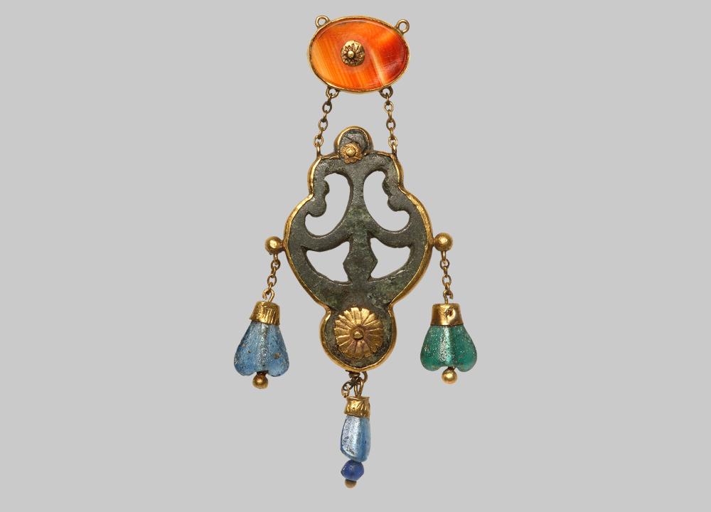 Mehrteiliger Anhänger mit durchbrochenem Mittelglied aus Steatit, in Goldblech gefasst. Dekor in Form zweier festgenieteter Blüten aus Goldblech. Aufhängung in Form einer in Goldblech gefassten querovalen Karneolgemme mit zentraler Goldblechblüte. Zwei kurze Goldkettchen verbinden Gemme und Mittelteil, von dem drei Anhänger aus Glas in Blüten- und Tropfenform abgehängt sind.