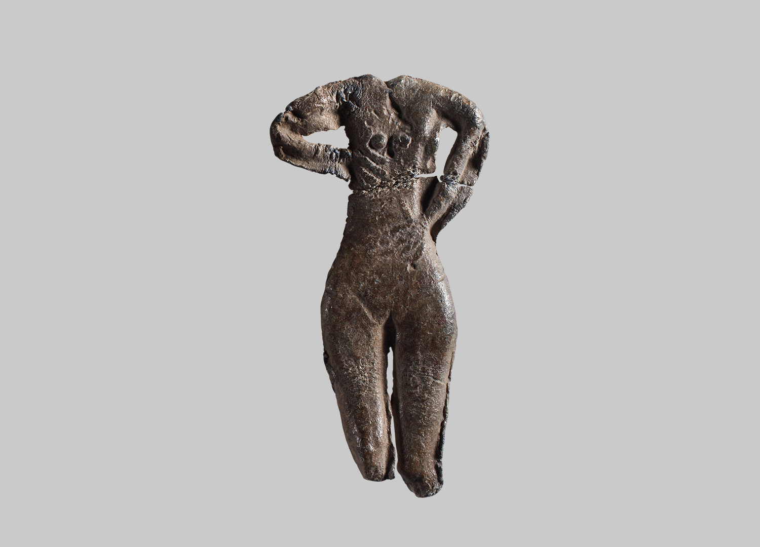Venus nackt und frontal stehend; rechte Hand unterhalb der rechten Brust und linke Hand auf linke Hüfte gelegt; stilisiert dargestellt; breite Gussnaht.