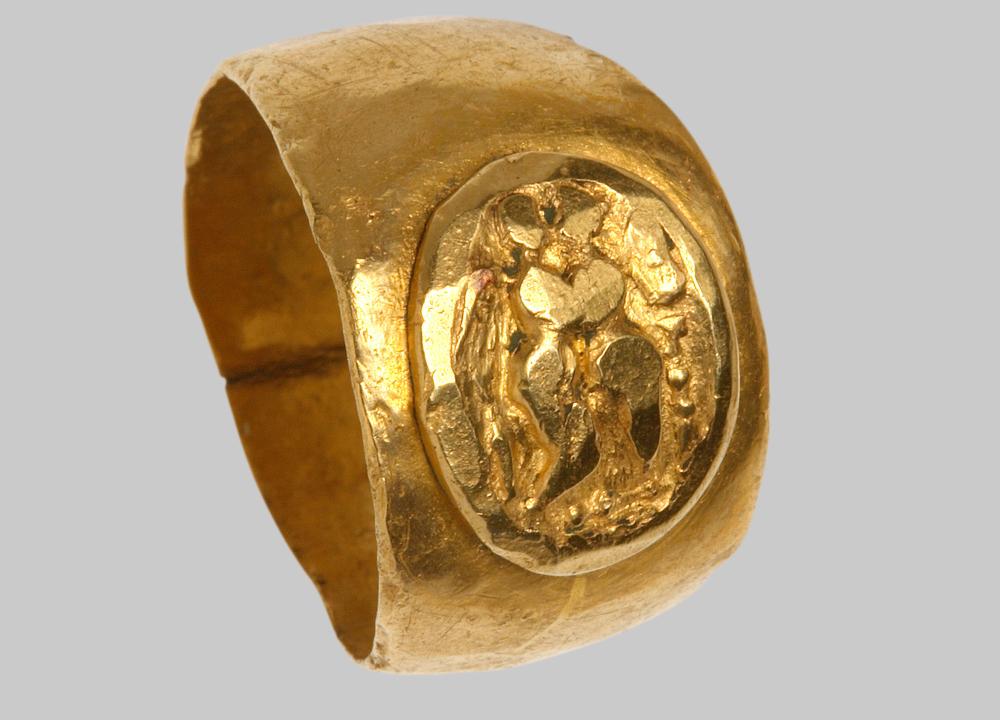 Reif aus dünnem breitem Goldblech, der sich zur Ringplatte stark verbreitert. Die Schultern sind oval, ohne Verzierung. Auf der ovalen, leicht erhabenen aufgelöteten Schmuckplatte (0,7 x 1,0 cm) erkennt man ein Relief, welches von einem glatten Rahmen umgeben ist. Das Relief ist undeutlich, es handelt sich wohl um zwei einander gegenüberstehende Figuren, eine davon weiblich und geflügelt, wahrscheinlich Victoria.
