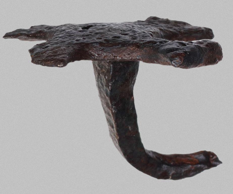 Schildbuckelnagel mit kreuzförmigem Kopf und im Querschnitt vierkantigem, fragmentiertem, gebogenem Schaft.