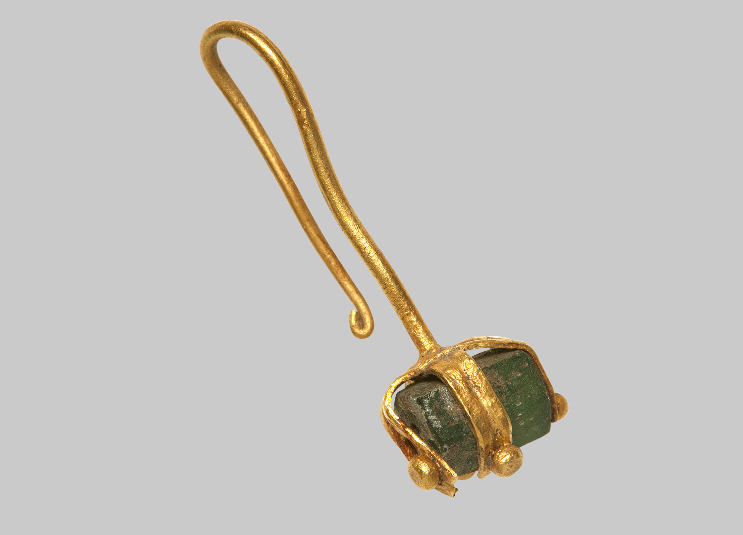 An einem langen, verbogenen Haken sind schmale Goldblechstreifen aufgelötet. Die Enden des Streifens sind nach unten gebogen und umfassen eine dazwischen auf Draht aufgezogene, sechsseitige prismatische Perle aus grünem Glas (Smaragdimitation). Ein zweiter gerippter Goldblechstreifen umfasst, von der Ansatzstelle des Hakens ausgehend, die Längsseiten des Schmucksteins. An jedem Abschluss der Blechstreifen ist eine Granulatperle angelötet.