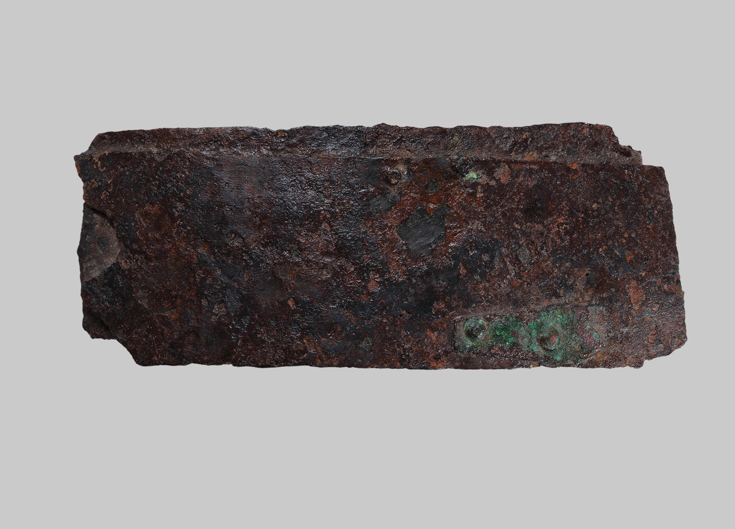 Drei Schienenfragmente mit fünf bronzenen Nieten und bronzenem Beschlag mit zwei Nieten.