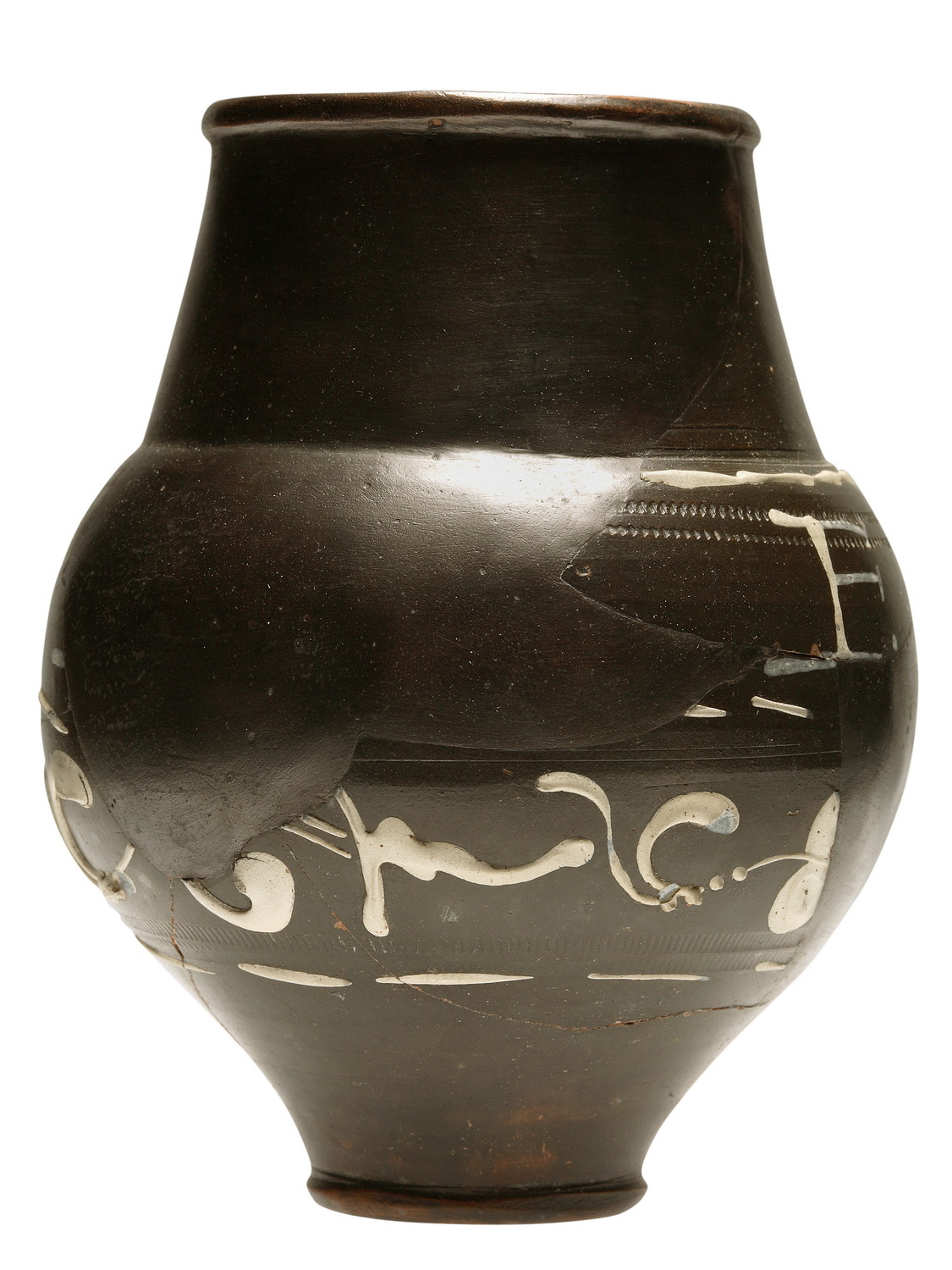 Spruchbecher, geklebt und ergänzt. Schwarzer, metallisch glänzender Überzug. Die kräftig gewölbte Bauchzone des Bechers ist mit einem feinen, zweireihigen Ratterdekor und Verzierungselementen aus weißer Barbotine verziert. Darunter versteht man das Auftragen einer schlickerartigen Masse mittels eines Spritzhörnchens auf ein ausgeformtes, noch ungebranntes Gefäß mit lederharter Oberfläche. Das Dekor besteht auf dem hier gezeigten Becher aus feinem Rankenwerk, strichförmigen Elementen sowie den erhaltenen Buchstaben "E" und "P".