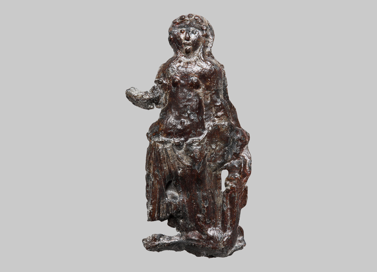 Venus frontal im Kontrapost stehend; mit nacktem Oberkörper und einem Mantel um die Hüften geschlungen und vor der Scham geknotet und verläuft hinten unterhalb des Gesäßes; über linker Schulter lang herabfallender Mantel gelegt; rundliches Gesicht mit Knopfaugen, breitem Nasenstrich und kleinem Strichmund, sowie Knubben-Kinn; schulterlange Haare, hinten im Nacken gerafft, Gesicht von Punkt-förmigem Kopfschmuck umrahmt; einreihige Perlenkette am Hals und Armreifen auf beiden Armen; rechter Arm angewinkelt und erhoben; linke Hand auf Kopf von Amor ruhend; Amor seitlich stehend, Körper grob geformt, Gesicht beschädigt; breite Gussnaht, Hohlform.