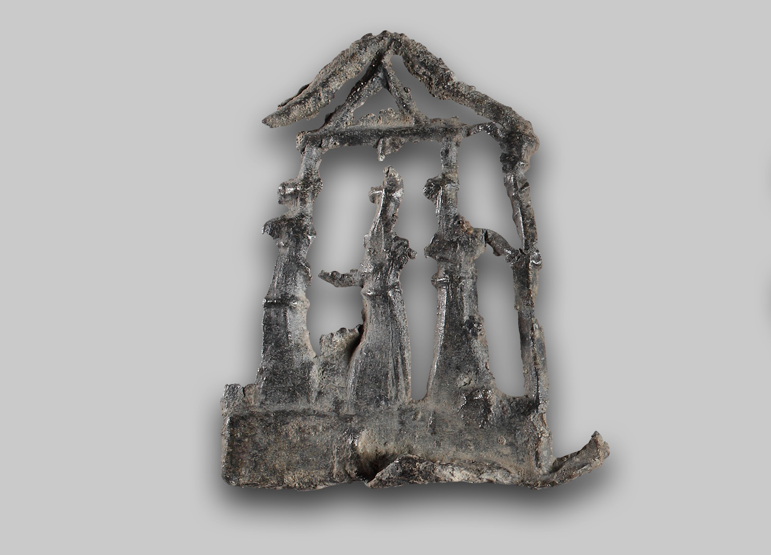 3 weibliche Figuren im langen, gegürteten Gewand; sehr stark stilisiert; Köpfe lediglich waagrechte Verdickungen; glatter, im Querschnitt dreieckiger Rahmen in Aedicula mit Spitzbogen und dreieckigem Giebel; rechter Rahmen weist drei Wülste im Eckbereich auf; hohe rechteckige Standleiste; rechts davon über 1 cm langer Gussfortsatz.