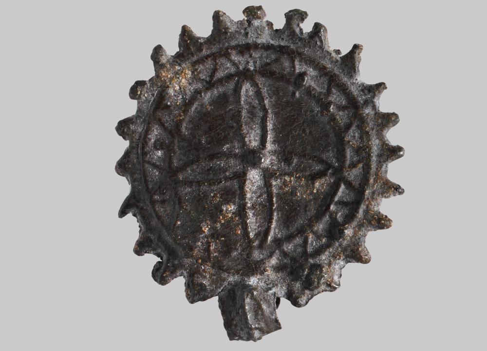 Votiv in Spiegelform; in der Mitte kreuzförmige Blume mit Noppe im Zentrum; Kreuz umschlossen von zwei konzentrischen Kreisen mit Zick-Zack-Muster; Rand mit radial angeordneten Zacken; unten Griff, im Querschnitt dreieckig und mit Fischgrätmuster.