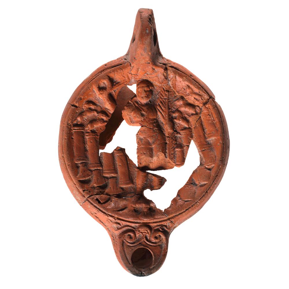 Bildlampe mit runder Schnauze und gerilltem Ringhenkel; auf dem Spiegel ist ein siegreicher Wagenlenker dargestellt. In seiner linken Hand hält er einen Palmzweig, in der erhobenen Rechten einen Siegeskranz. Seitlich von ihm erkennt man je drei Preiszylinder, bekrönt von je einem Pferdchen.