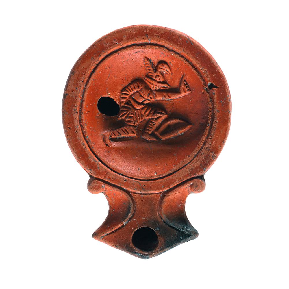 Bildlampe. Auf dem Spiegel Darstellung eines Gladiators. Er ist im Begriff, in die Knie zu gehen, sein Schild liegt bereits am Boden. Die linke Hand mit der Waffe ist noch erhoben. Auf dem Kopf trägt er einen Helm.