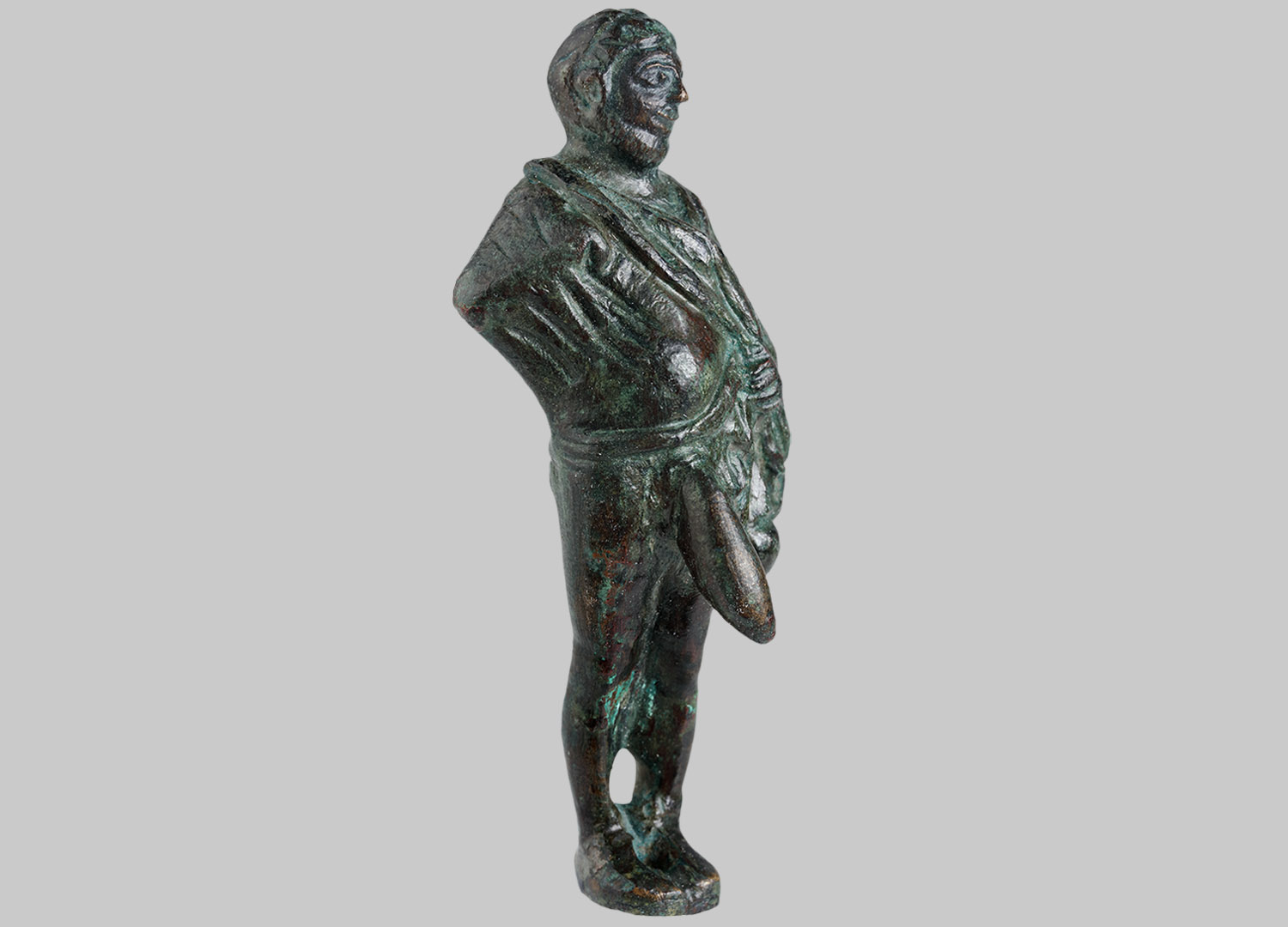 Die stehende Figur hat die rechte Hand in die Hüfte gestützt. Die linke Hand trägt möglicherweise einen taschenartigen Gegenstand oder rafft lediglich den Mantel beiseite, um das überdimensionierte, gekrümmte Genital zu entblößen. Der bärtige Kopf ist schief geneigt und leicht gesenkt, der Bauch ist vorgestreckt. Am Rücken reicht der reich gefaltete Mantel bis über den Ansatz des Gesäßes hinunter. Beide Unterschenkel und Füße sind durchbohrt. Die Darstellungen grotesk disproportionaler Gestalten (sogenannte „grylloi“) waren in der Antike eine beliebte Quelle der Heiterkeit.