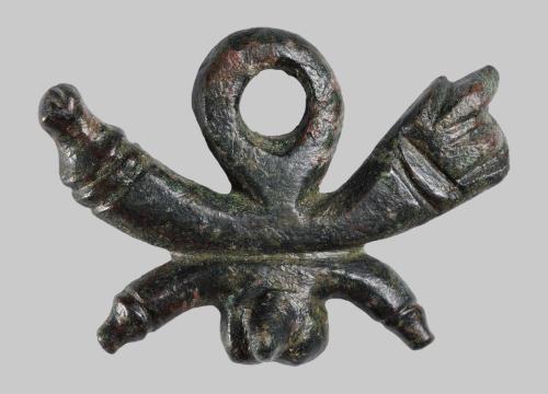An Aufhängeöse ein Amulett mit zwei halbmondförmigen Hälften. Der obere »Halbmond« kehrt seine Hörner nach oben; eines endet in einen Phallus, das andere in eine Handdarstellung mit der Geste der »Feige«. Der untere »Halbmond« kehrt beide phallisch endenden Hörner nach unten. An ihm hängt ein naturalistisches Bild von Hoden und erigiertem Phallus.