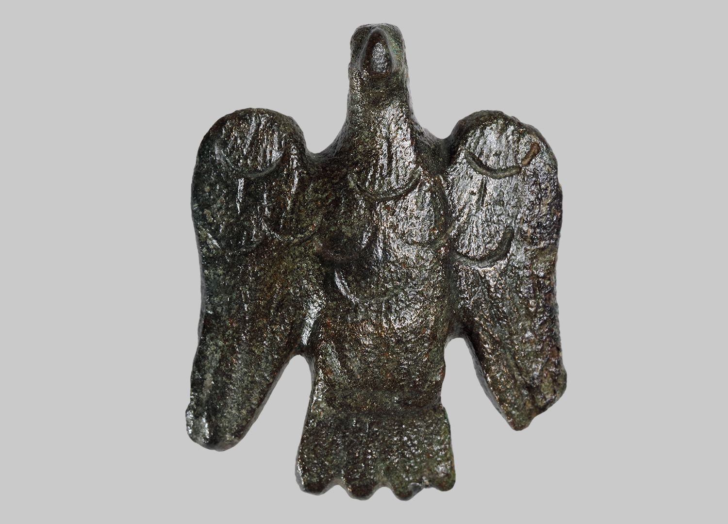 Frontal dargestellter Adler mit ausgebreiteten Flügeln. Das Gefieder ist durch Gravuren angedeutet. Auf der Rückseite befinden sich je zwei Befestigungsstifte pro Flügel.
