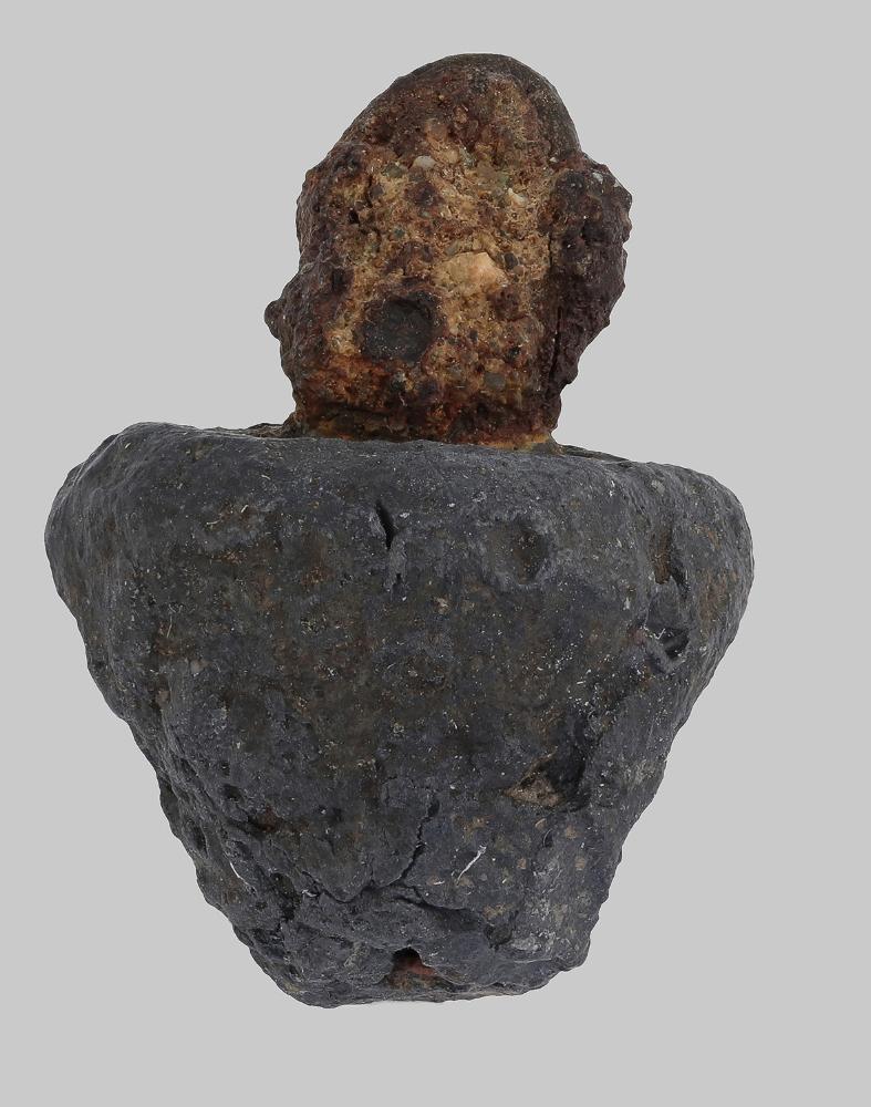 Kleiner, kegelförmiger Körper aus Blei, teilweise kantig; oben Öse aus Eisen