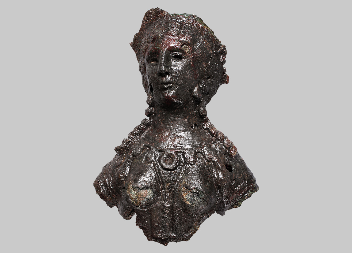 Erhalten ist der Oberkörper von der rundplastischen Darstellung einer Göttin mit aufwändigem Schmuck. Die in der Mitte gescheitelten Haare rahmen wellenförmig das Gesicht und sind im Nacken geknotet. Lange, gedrehte Locken fallen bis auf die Schultern herab. Im Haar sitzt ein Diadem, das nur unvollständig erhalten ist. Auf Brust und Schultern ist eine schwere Kette mit mehreren Anhängern und länglichem Mittelstück gelegt. Die Göttin trägt wahrscheinlich Ohrschmuck. Es könnte sich um eine synkretistische Darstellung der Isis-Venus handeln; die Isiskrone wäre dann oberhalb des Diadems abgebrochen. Im Inneren der Büste ist der Gusskern erhalten. Verschiedene Fehlstellen lassen vermuten, dass es sich um einen Fehlguss handelt.