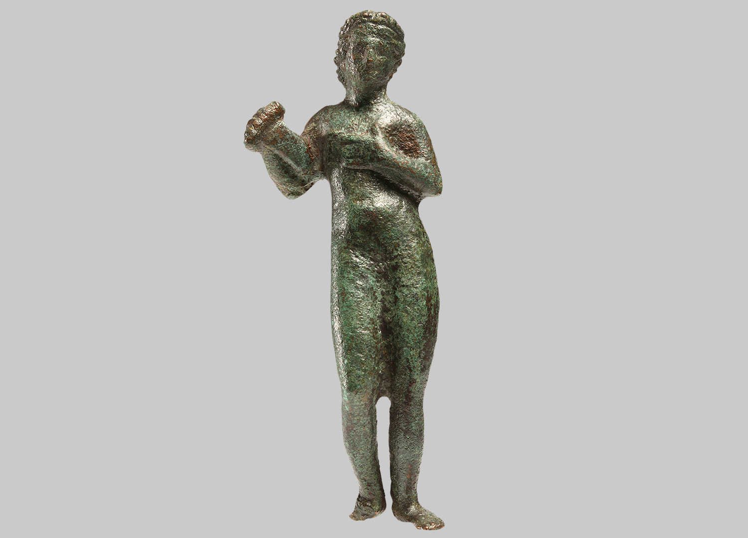 Stehende Venus mit leicht gesenktem Kopf und Haarband, unbekleidet bis auf das Brustband (fascia pectoralis), das sie gerade anlegt. Das Ende des Bandes fasst sie mit der Rechten und zieht es straff nach vorn. Die Linke hält das Band auf der Brust fest.