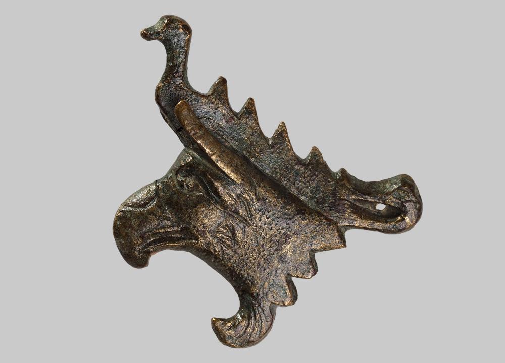 Griff mit Greifenkopf. Der geschlitzte untere Rand zur Aufnahme der separat eingesetzten, hier aber verloren gegangenen Eisenklinge ist gezackt und endet vorne in einem bogenförmig geschwungenen Fortsatz. Den oberen und unteren Abschluss des gezackten Kamms bilden zwei Vogeldarstellungen (Enten?). Verzierung mit Gravur und Punzierung.