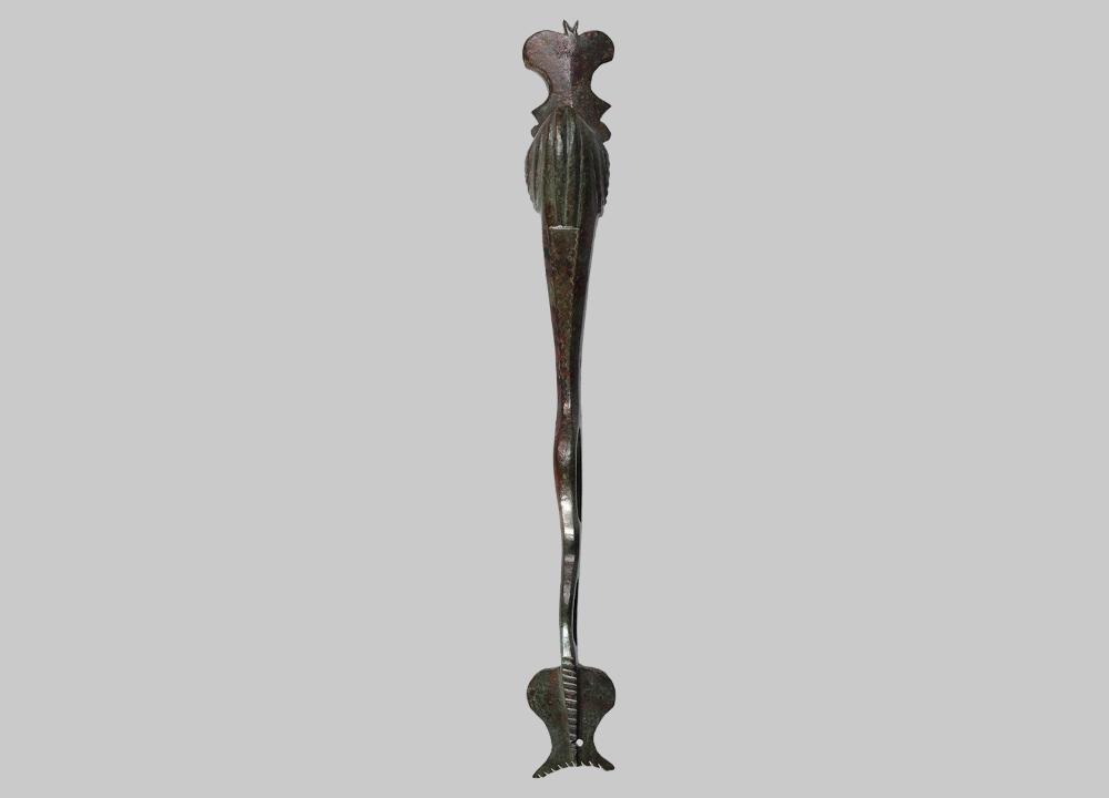 Schwertriemenbügel in Form eines stilisierten Delphins. Eine seitlich profilierte sowie vom restlichen Körper deutlich abgesetzte flache Platte bildet das Maul. Auf dem Kopf des Delphins eine zentrale Längsfurche und je eine seitlich anschließende und mit Kerbdekor versehene Flosse. Auf dem Bügelrücken zwei Schlaufen unterschiedlicher Größe. Die Schwanzflosse ist flach, gelocht und weist am unteren Rand Kerbdekor auf. Der im Bereich der Schwanzflosse auslaufende Bügel zeigt ebenfalls einen gekerbten Strichdekor. Der mehrkantige Bügel ist auf der Oberseite, anschließend an die zentrale Längsfurche des Kopfes, zum Teil mit einem geschwungenen Dekor verziert. Auf der Unterseite des Bügels je ein Nietstift im Bereich des ersten Schlaufenansatzes sowie im Bereich des Mauls.