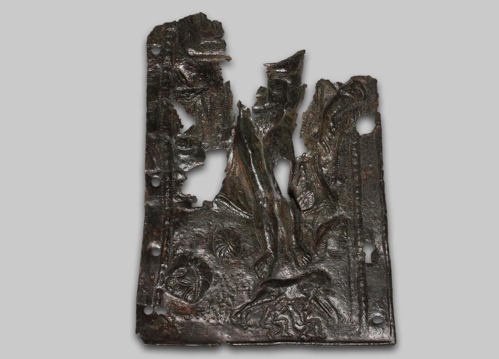 Fragment eines einteiligen Panzerverschlussblechs mit sieben erhaltenen Nietlöchern an den Seitenrändern. Einteilige Verschlussbleche weisen eine trapezoide Form auf und wurden mit Hilfe von Nieten und Knöpfen an den Panzern befestigt. Der nicht erhaltene obere Abschluss war für die Halspartie gerundet.