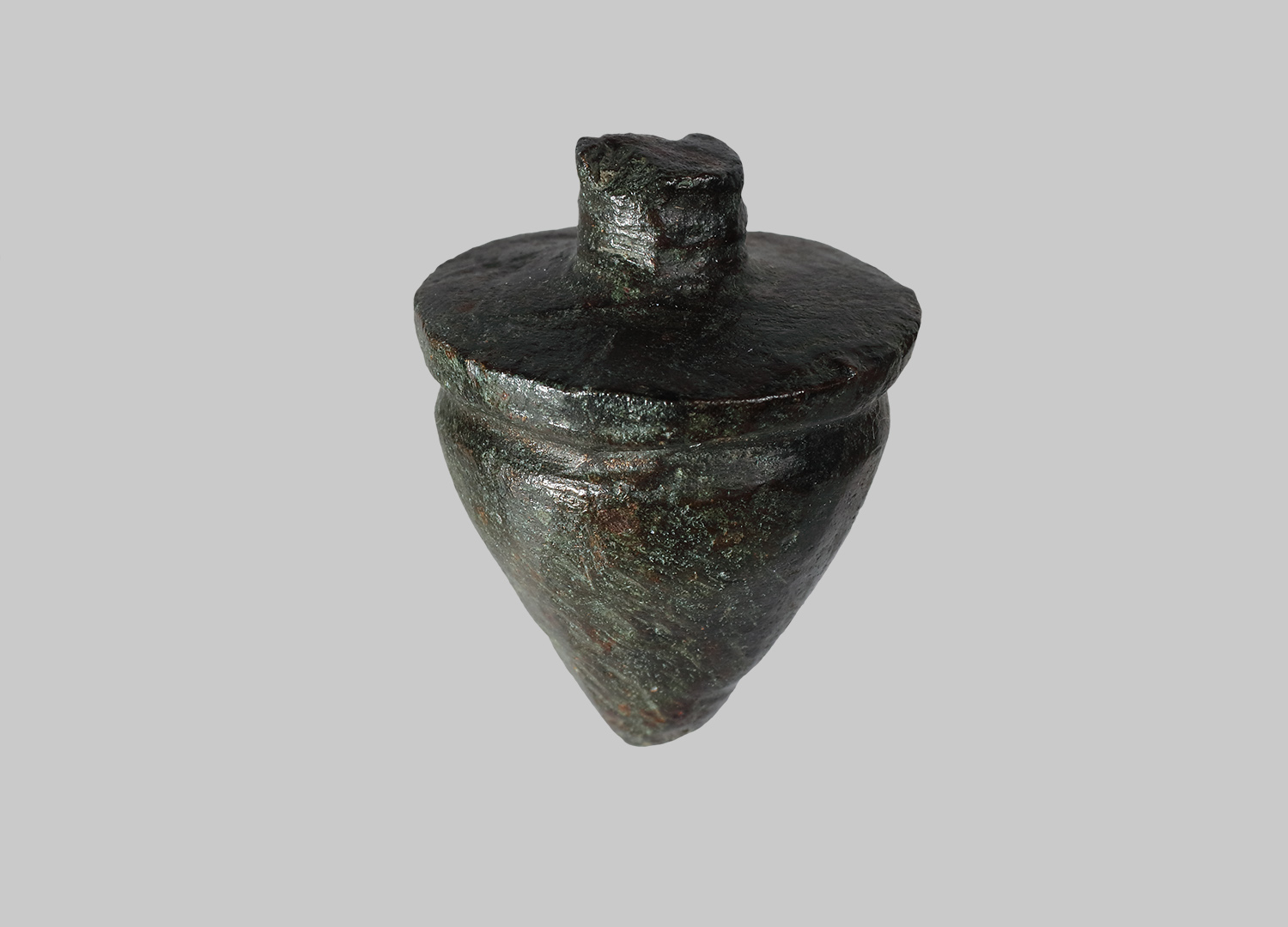 Kegelförmig, mit runder Basis. Nietstift erhalten. Wurde zur Befestigung der Kreuzbügelverstärkung auf der Helmkalotte (Helmtyp Niederbieber) verwendet.