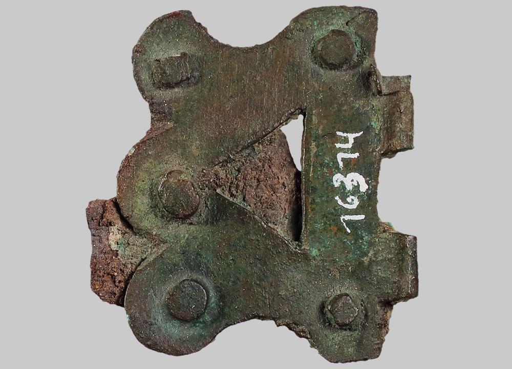 Palmettenförmig. Alle fünf Nieten sind noch erhalten. Ursprünglich auf einer eisernen Panzerschiene montiert. Reste davon sind noch erhalten. Palmettenförmige Schulterscharniere sind typisch für den Schienenpanzer vom Typ Corbridge.