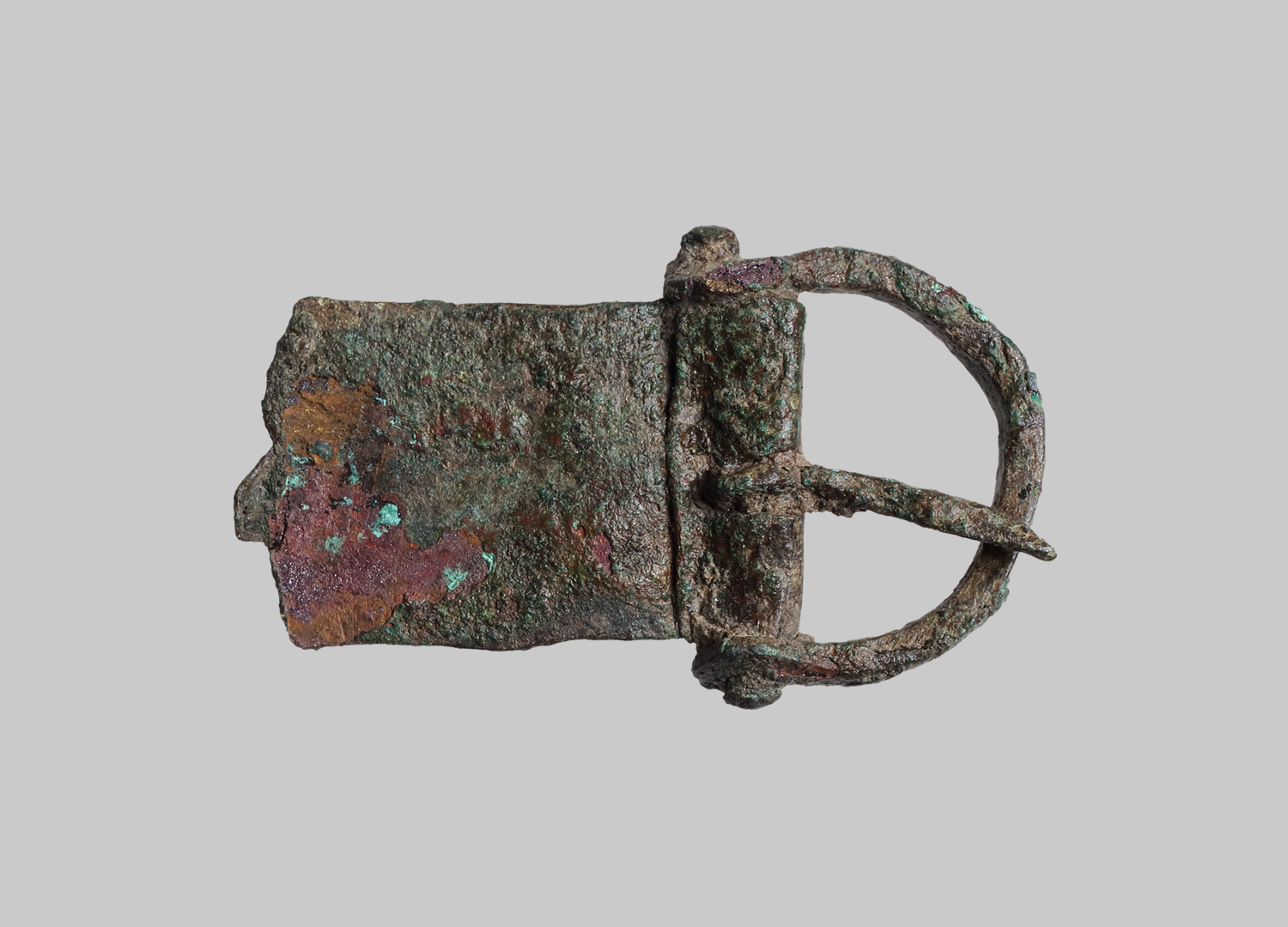 Schnalle mit D-förmigem Bügel und Dorn. Der hintere Abschluss des rechteckigen Beschlags fehlt.