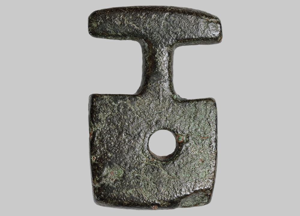 Viereckige, gelochte Platte mit Stift und verbreitertem Gegenstück. Diente als Drehverschluss von paarweise getragenen Panzerverschlussblechen, die im Brustbereich befestigt waren. Zur Fixierung wurde ein Stift oder Splint durch das Knebelloch gesteckt.