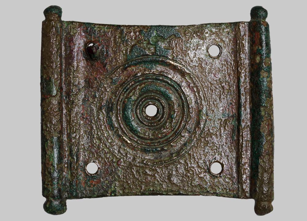 Rechteckiger massiver plattenförmiger Beschlag mit vier Nietlöchern in den Ecken und einer erhaltenen Niete. Im Zentrum eingedrehte konzentrische Kreise. Pseudoscharnierachsen verstärken die beiden kürzeren Seiten des Beschlages.