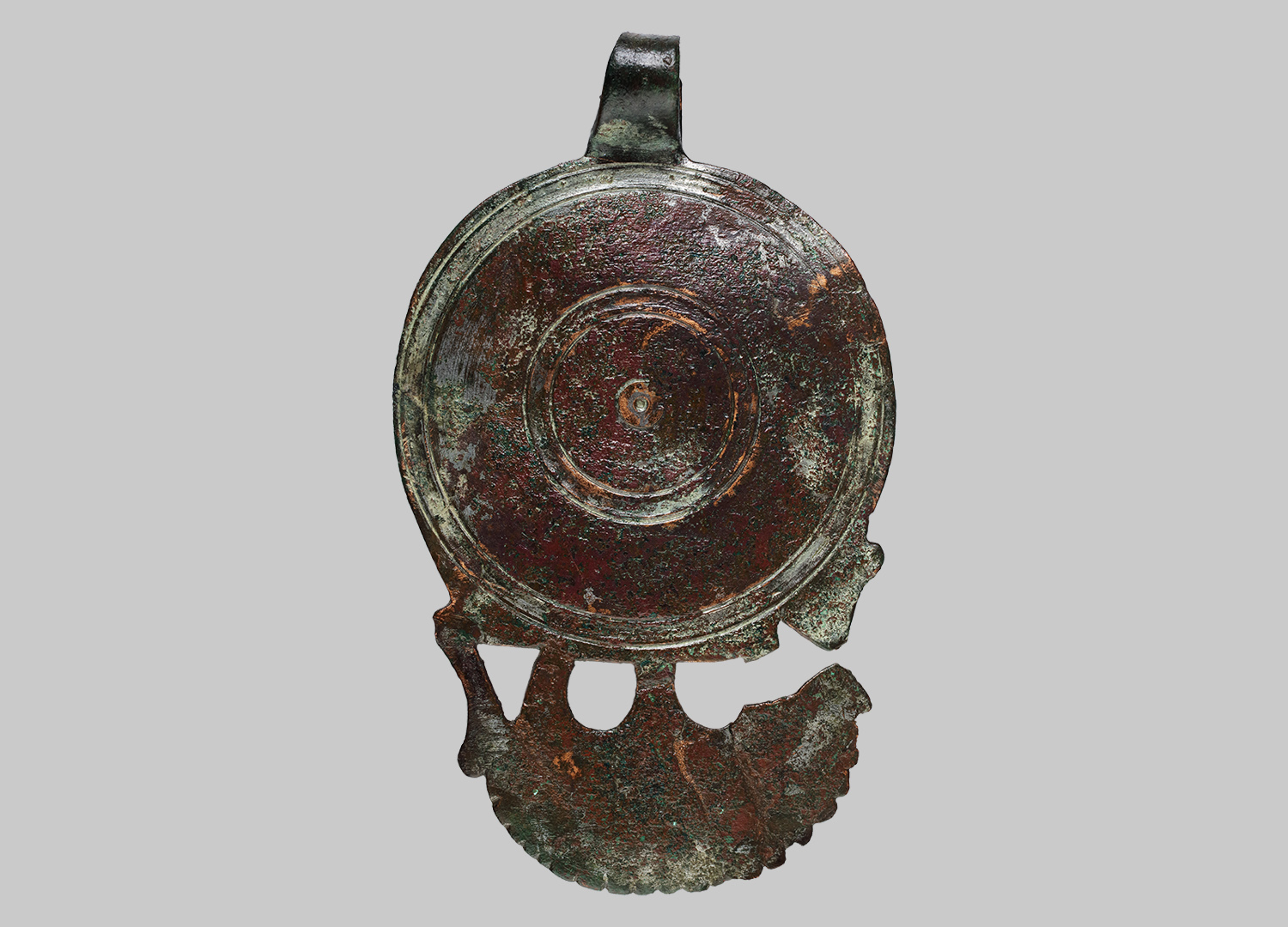 Scheibe mit eingravierten konzentrischen Kreisrillen und hakenförmig umgebogenem Aufhängeblech. Halbkreisförmiger, durchbrochener unterer Abschluss mit gewelltem Rand.
