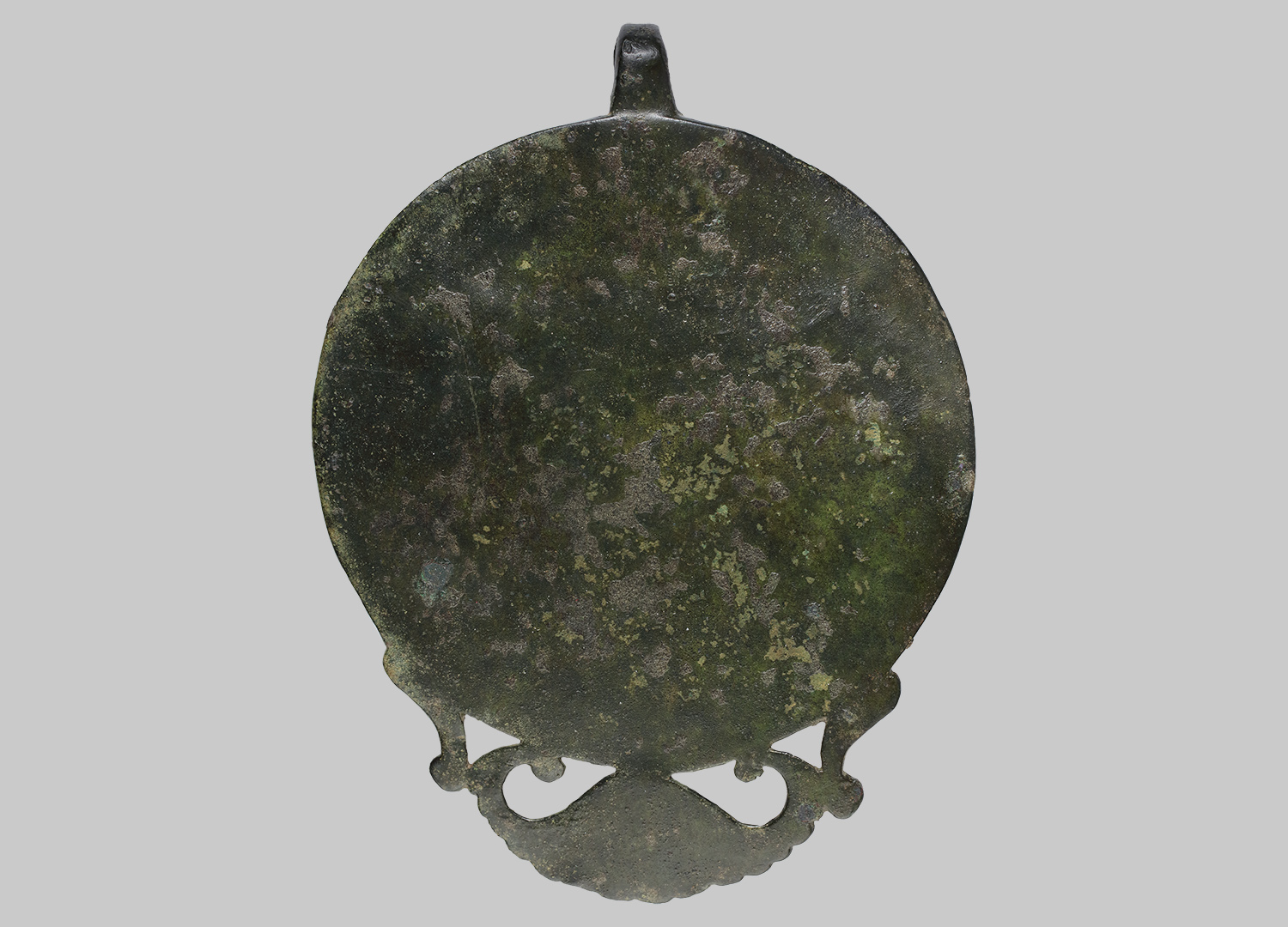 Große unverzierte Scheibe. Durchbrochener unterer Abschluss mit gewelltem Rand. Hakenförmig umgebogene Aufhängung auf der Rückseite fixiert.
