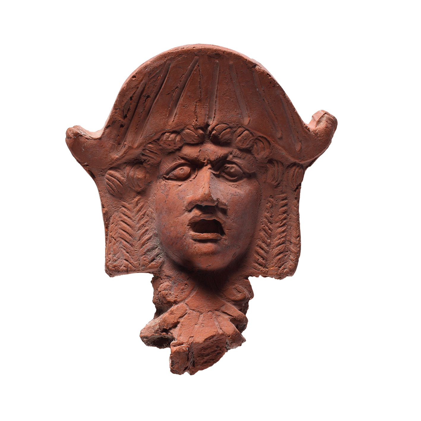 Der Kopf wächst aus einer Palmette heraus. Der hohe Onkos (Perücke) besteht aus langen senkrecht gedrehten Locken. Das Gesicht zeigt feine Züge.
